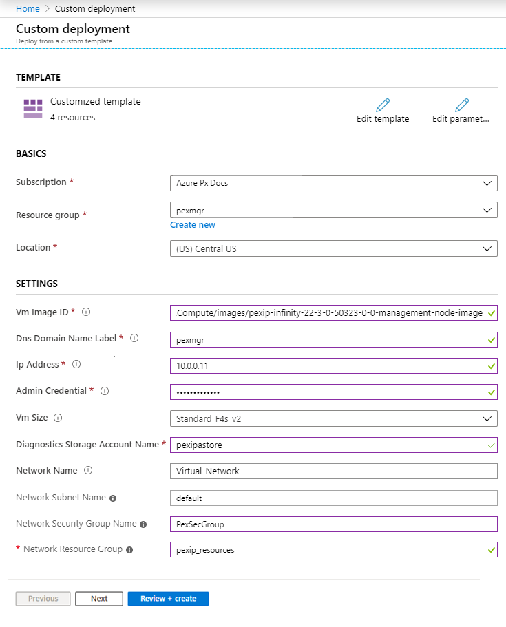 New-AzResourceGroupDeployment -ResourceGroupName pexmgr -TemplateUri https://pexipas.blob.core.windows.net/templates/20220112/virtual-machine-password-static-public-ip.json -vmImageID "/subscriptions/1bc-etc-9yz/resourceGroups/pexip_resources/providers/Microsoft.Compute/images/pexip-infinity-22-3-0-50323-0-0-management-node-image" -dnsDomainNameLabel pexmgr -ipAddress "10.0.0.5" -adminCredential $Credential -vmSize Standard_F4s_v2 -diagnosticsStorageAccountName pexipastore -networkName pexip_virtual_network -networkSubnetName default -networkSecurityGroupName PexSecGroup -networkResourceGroup pexip_resources