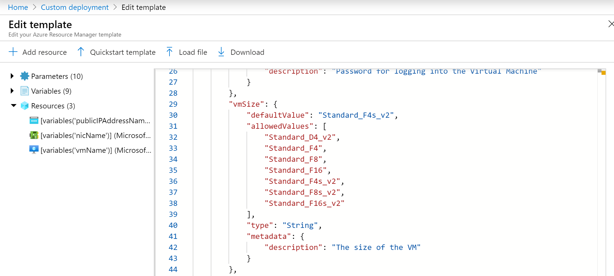 3. In the vmSize section, add in the name of resource that you have identified above.