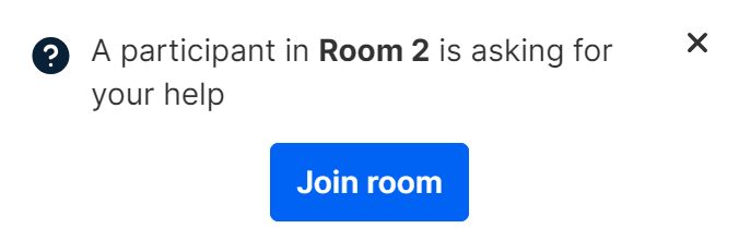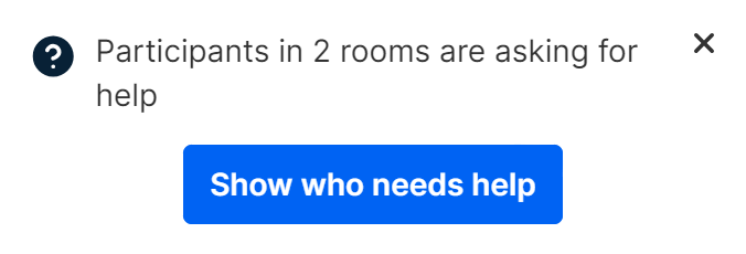 Guest participants in a breakout room can ask for help i.e. summon a Host to the room. When a participant in a breakout room asks for help, all Hosts who are not already in that room see a message:
