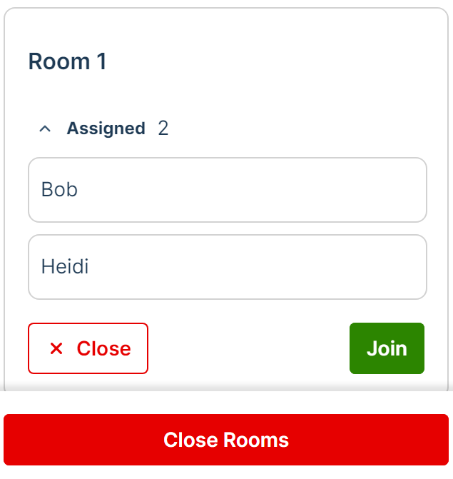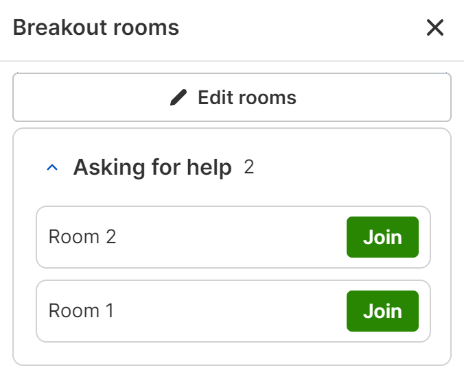 If there are multiple rooms, Hosts can select . This opens the Breakout rooms panel which shows a list of all pending requests for help and provides an option to join that room. The requests are shown in time order (oldest at the top):
