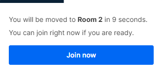 - When Webapp3 participants are being moved between rooms, they see a modal telling them how long until they are moved (and giving them the option to move immediately). By default this modal lasts for 15 seconds, but administrators can use the transferTimeout branding option to control how long this modal appears, or remove it completely. Participants using other types of endpoints are moved immediately and do not see the modal.