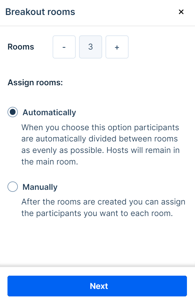 - Automatically: this divides participants randomly and as evenly as possible across the rooms. You can still reallocate participants manually afterwards.