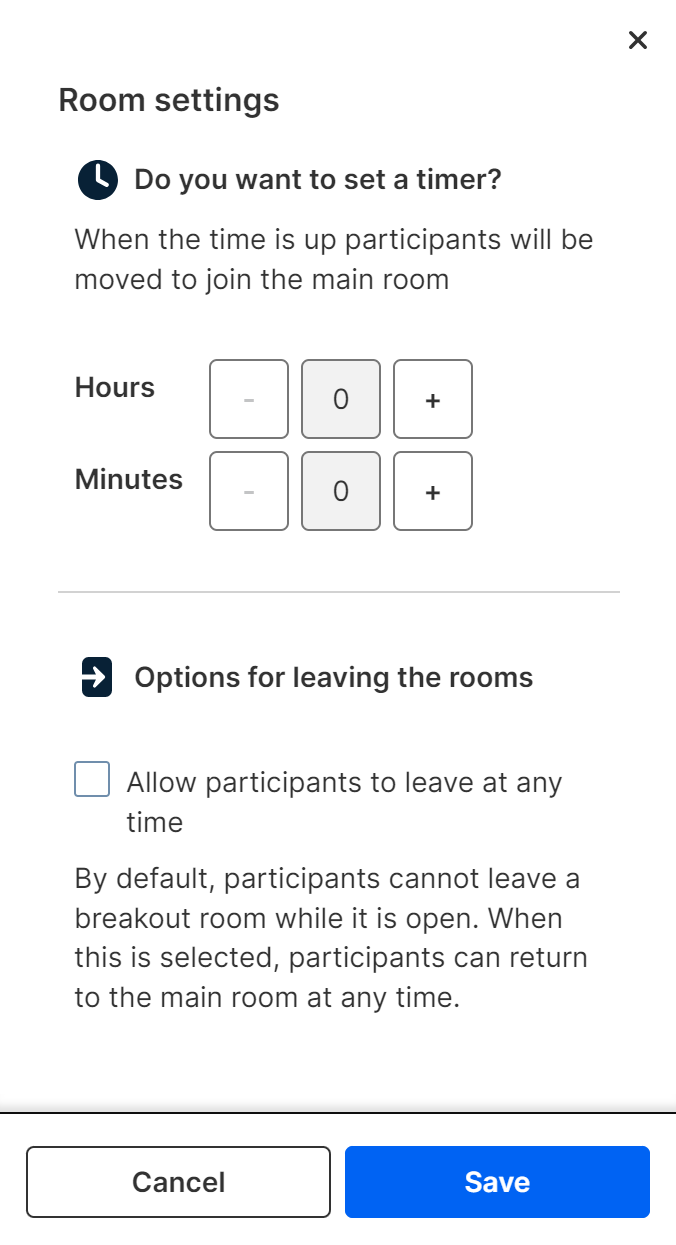 - You can optionally set a timer duration. When the time is up, all participants are automatically returned to the main room.