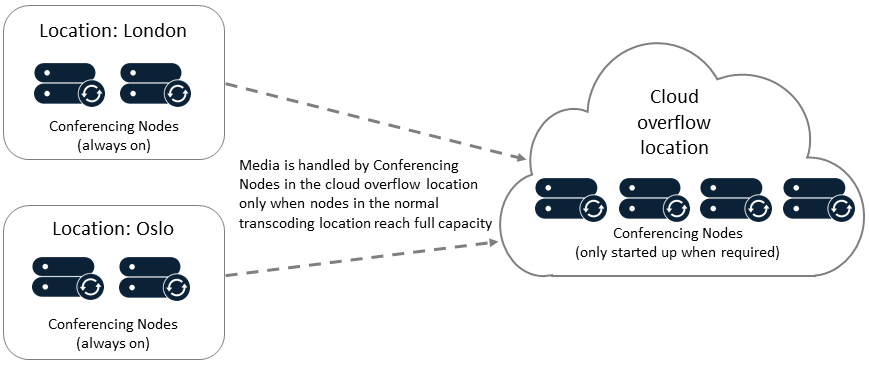 This provides the ability to dynamically expand conferencing capacity whenever scheduled or unplanned usage requires it. The cloud Conferencing Nodes instances are only started up when required and are automatically stopped again when capacity demand normalizes, ensuring that cloud provider costs are minimized.