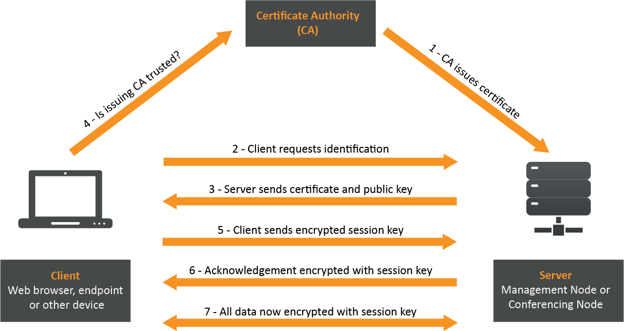 TLS certificates are used by the Management Node and each Conferencing Node to verify their identity to clients connecting to them over HTTPS (web) or SIP TLS. These clients include: