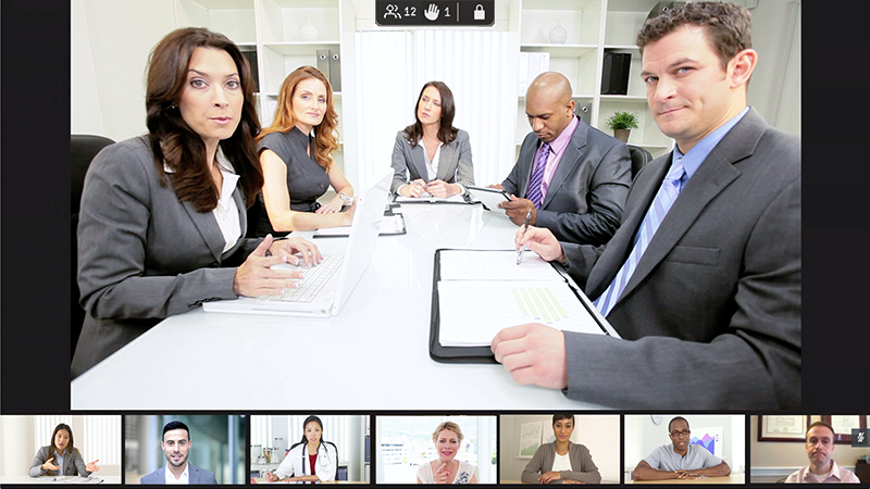 • A maximum of 12 video participants are shown, spread across one row of 2 large images, a middle row of 3 slightly smaller images and a bottom row of 7 thumbnail images.