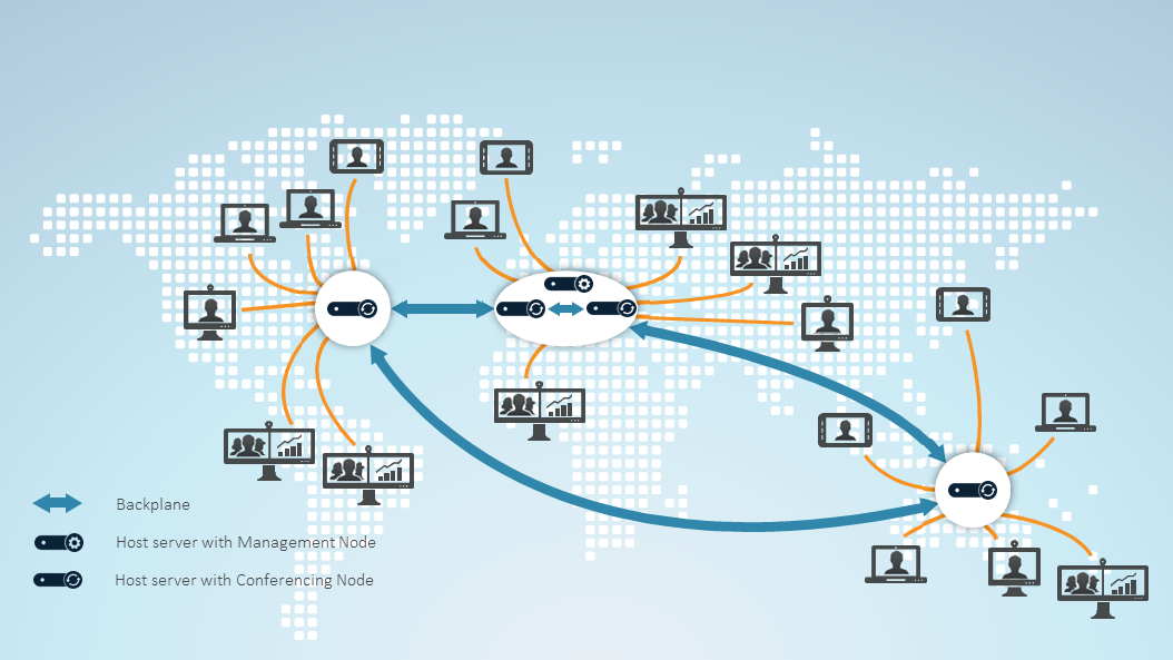 Globally distributed conferences exist across several Transcoding Conferencing Nodes, where each node is in a different system location. As system locations are typically used to represent different physical locations, this allows participants in different regions to access the conference from their local Conferencing Node. The nodes send the call media for the conference to each other over a single geo backplane, with each node sending the media on behalf of all the endpoints connected (or proxied) to it, thus minimizing WAN bandwidth usage between locations.