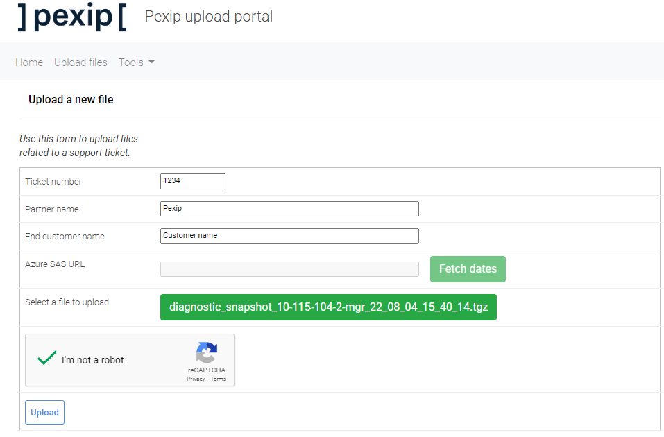 The Pexip upload portal is a web tool used by Pexip Infinity administrators to upload snapshots or logs when requested by your Pexip authorized support representative. When the data is uploaded, they are encrypted (see Encryption methodologies) and your Pexip authorized support representative receives the encrypted file along with the encryption key.