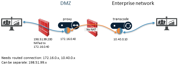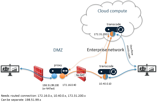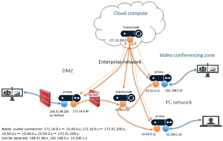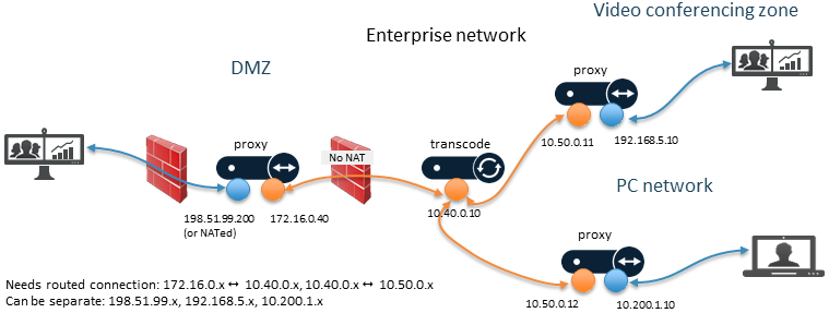 • The private IP addresses in the DMZ (172.16.0.x) and the internal NICs (10.50.0.x) on the proxying nodes handling the video conferencing and PC networks need a routed connection to the enterprise network (10.40.0.x).