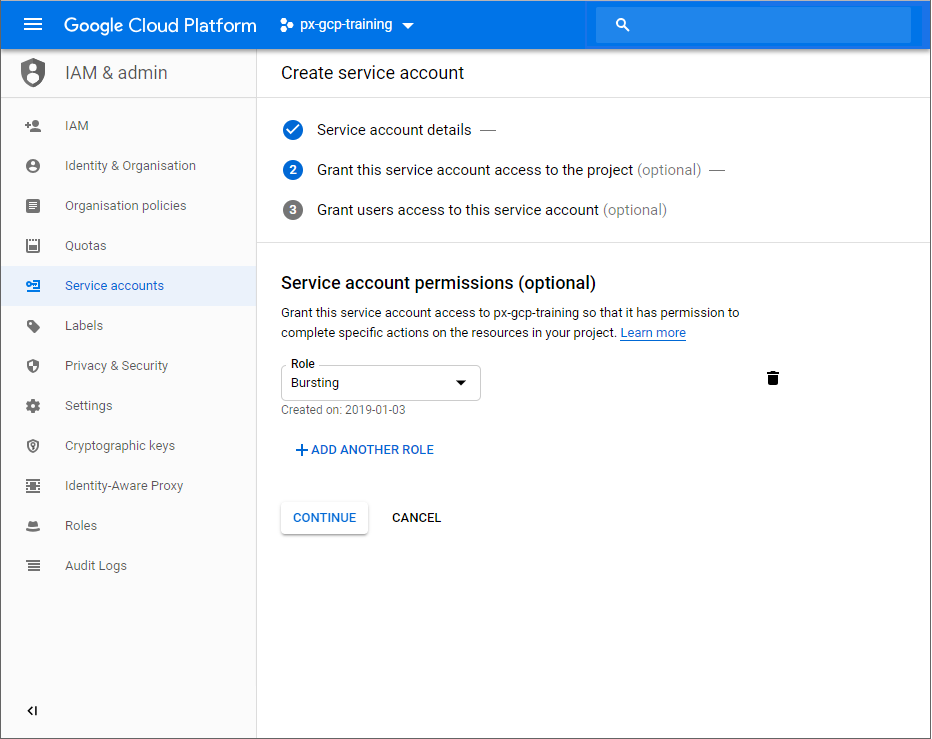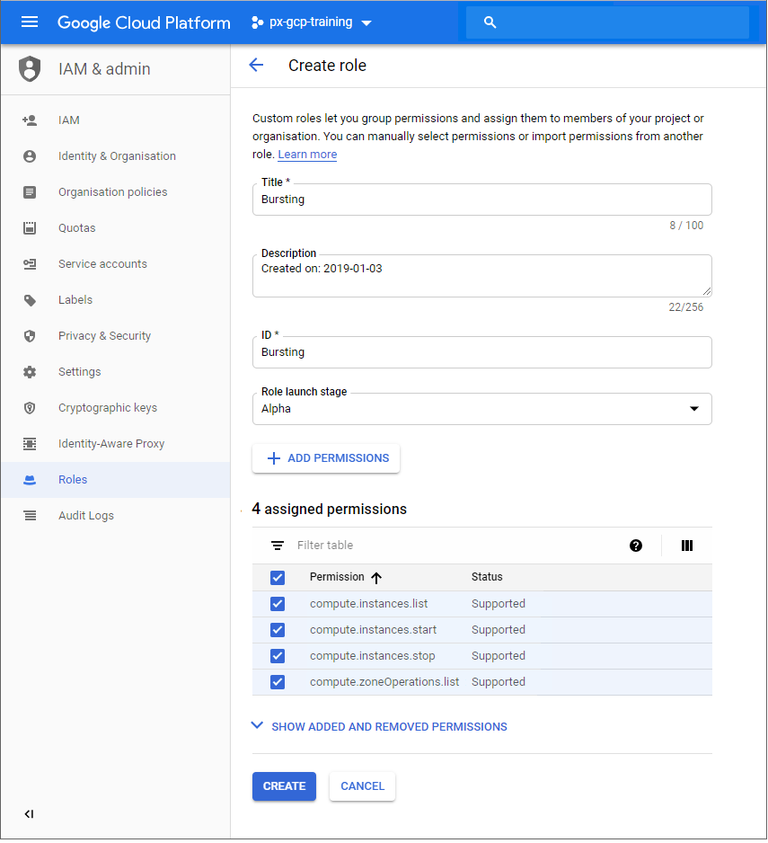 2. In GCP, set up the service account, roles and permissions that the Pexip Infinity Management Node will use to log in to GCP to start and stop the node instances.