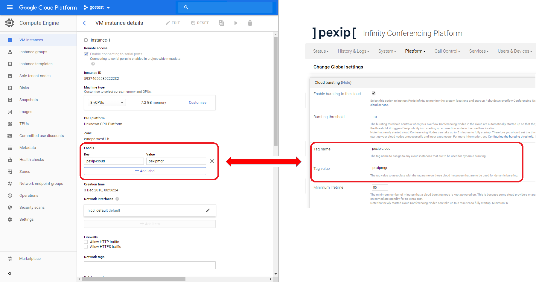 1. Apply to the instance a label with a Key of pexip-cloud and an associated Value set to the Tag value that is shown in the Cloud bursting section of the Platform > Global settings page.