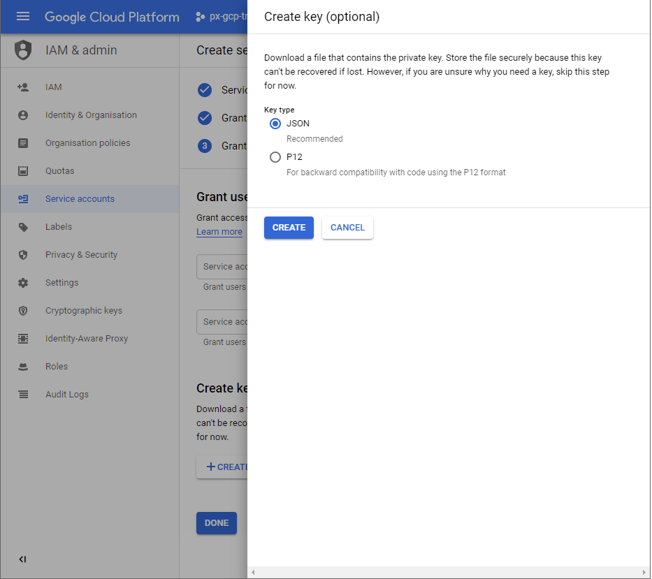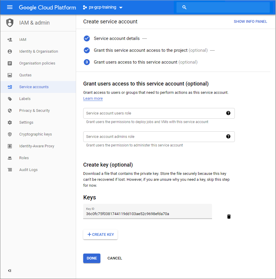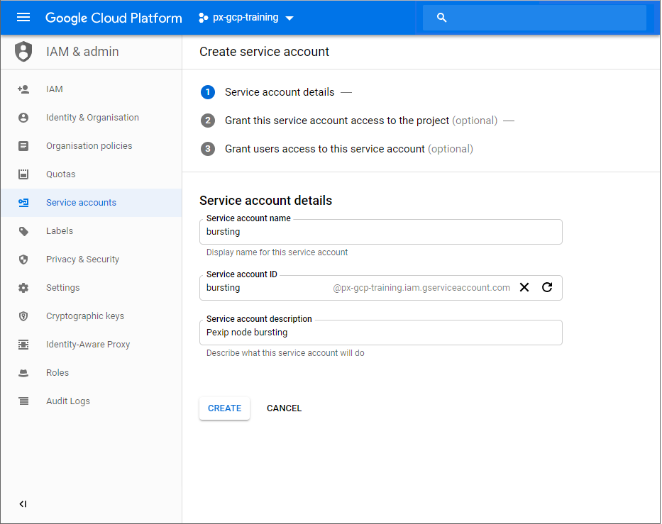 The Service account ID is automatically created, based on the name you enter, and is what you need to configure in the GCP service account ID field in Pexip Infinity.