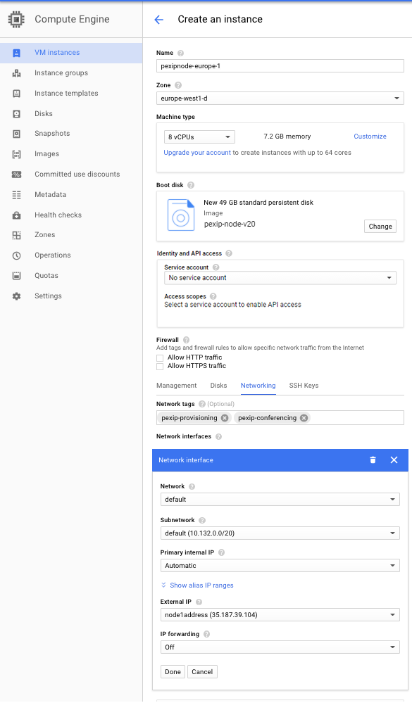 When the node is up and running you can optionally remove the "pexip-provisioning" Network tag from the instance (or whichever tag you have associated with your provisioning firewall rule as described in Controlling access to Conferencing Nodes for installation/provisioning ) as it is no longer required. Note, do not delete the firewall rule or remove the "pexip-conferencing" tag.