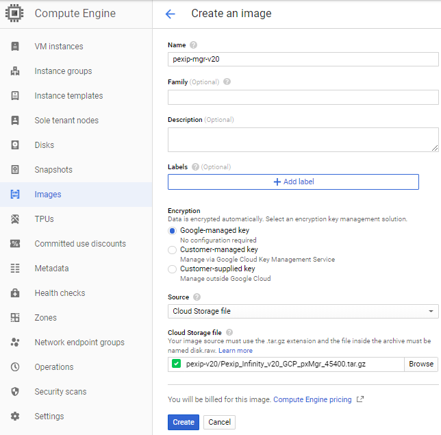 - Select and select the Conferencing Node image package in your storage bucket e.g. pexip-v39.