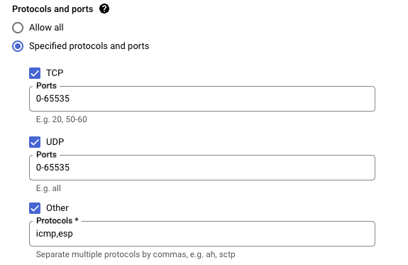 Note that this change adds ESP to the existing rule but does not remove or restrict any of the other default protocols and ports. This is because the default-allow-internal rule applies to all instances in your GCP project, and if you have something other than Pexip Infinity running (e.g. a reverse proxy, or something completely unrelated) then you probably want to allow UDP and TCP traffic to work.