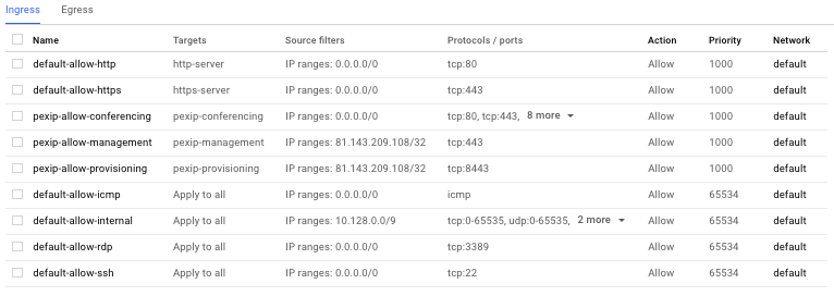 Name Enter a name for the rule, for example "pexip-allow-provisioning". Direction of traffic Select Ingress. Action on match Select Allow. Targets Select Specified target tags. Target tags Enter a tag name, for example "pexip-provisioning". You will use this name later when you create your Conferencing Node VM instances to associate those instances with these firewall rules (see Deploying a Conferencing Node in Google Cloud Platform). Source filter Select IP ranges. Source IP ranges Enter the <IP address/subnet> of the management station/browsers that require access to the Conferencing Nodes.