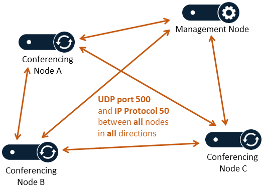 In larger deployments you may choose to deploy your Conferencing Nodes across multiple VPCs — in which case there must be a directly routable path (no NAT) between all nodes that allows UDP port 500 (IKE), and IP Protocol 50 (IPsec ESP) to pass between all nodes in both directions.