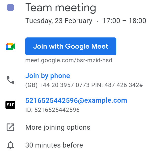 Users in your organization can schedule meetings as normal via their Google Calendar or Outlook (with the Google Outlook add-in for Office 365), and choose to add Google Meet conferencing within their event options. The joining instructions for internal and external standards-based video conferencing systems, and Skype for Business users, are then automatically included in, or linked from, the calendar invitation and event.