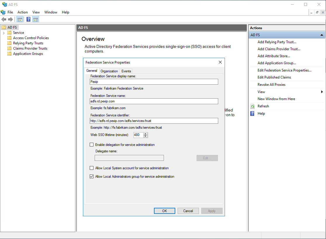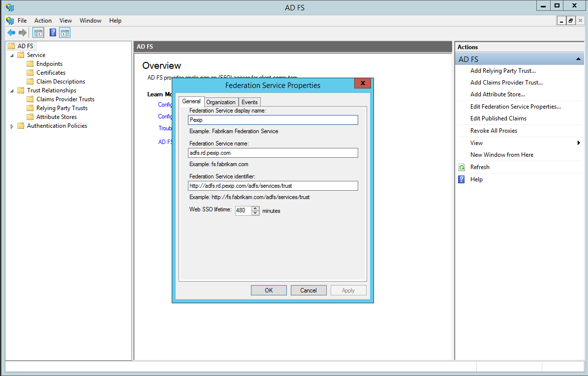 To add an AD FS OAuth 2.0 Client to the Pexip Infinity Management Node, you must first determine your Federation Service Name (this is the FQDN that clients use to access AD FS) and Federation Service Identifier. To check these: