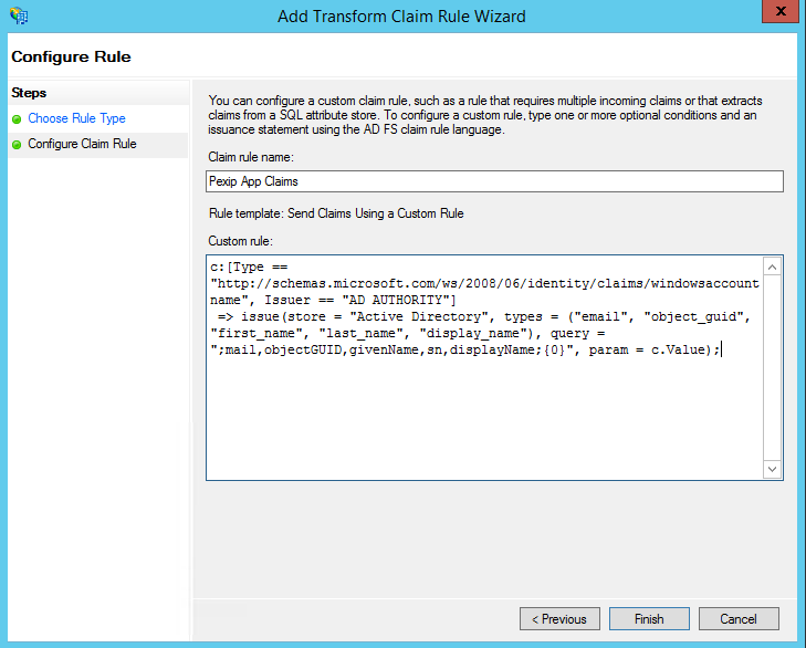 5. At the Configure Rule screen, enter a Claim rule name, and in the Custom rule section enter the following: