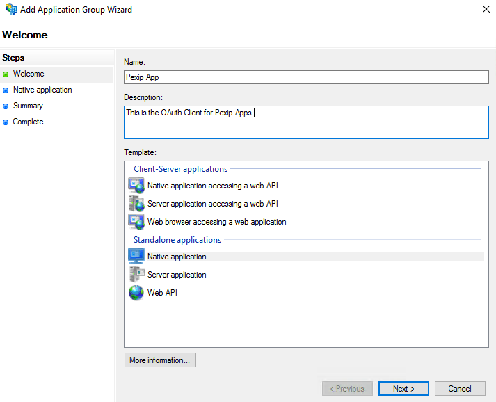 4. At the Welcome screen, enter a Name and Description for the application group. Then from the Template section, under Standalone applications, select Native application.