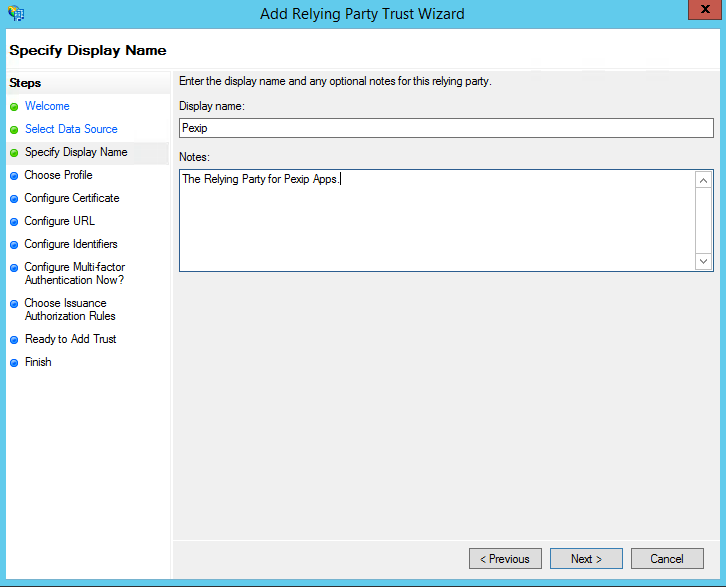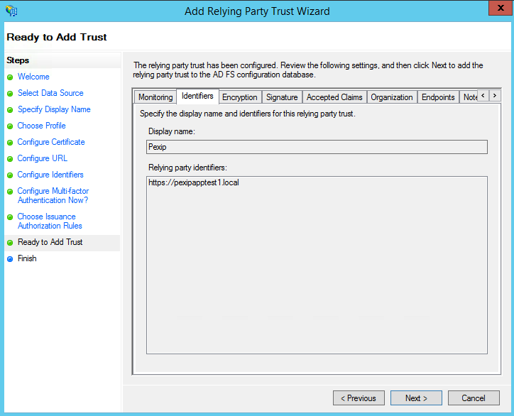 In this step you create a Relying Party Trust, which acts as the resource that is accessed when users authenticate to Pexip Infinity using their AD credentials.