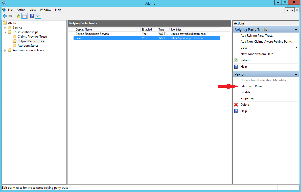 2. From the left-hand panel expand AD FS > Trust Relationships > Relying Party Trusts, select the Relying Party you just created, and from the right-hand panel select Edit Claim Rules....