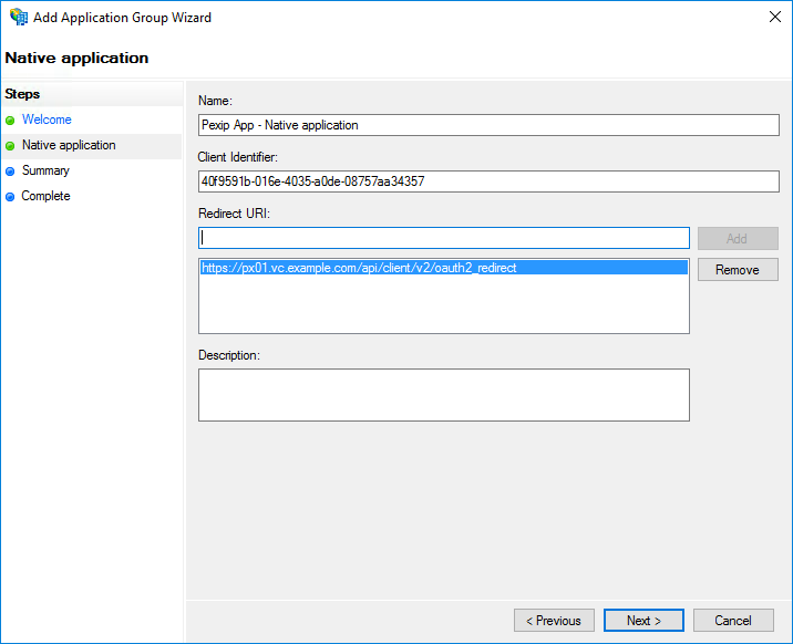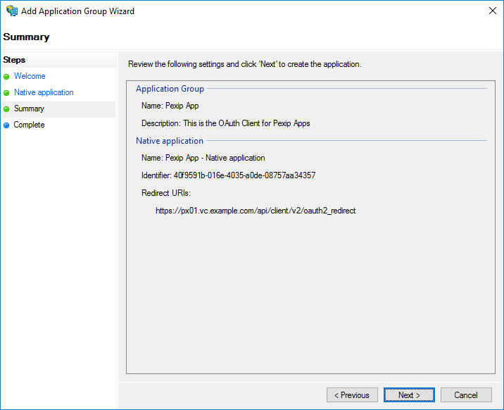 In this step you create a new application group with a new native application for the OAuth client — which is the Connect app in this case.