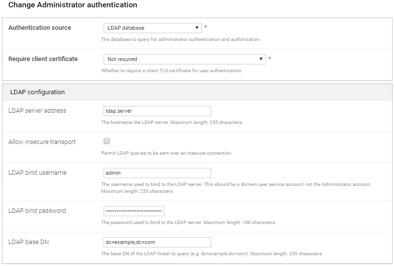 Note that all LDAP distinguished names must be entered as per the LDAP standard (RFC 4514). LDAP configuration is case insensitive.