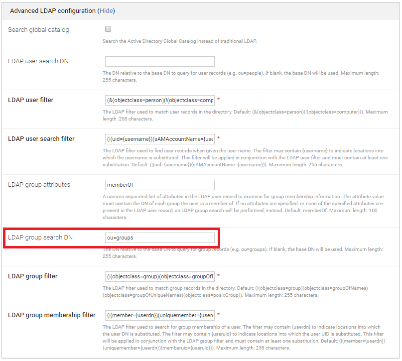 | LDAP group search DN | The DN relative to the LDAP base DN to query for group records (e.g. ou=groups) when no group attributes are present in the LDAP user record. If blank, the LDAP base DN is used. In deployments with large user bases, you may want to configure this to optimize the LDAP group queries. |