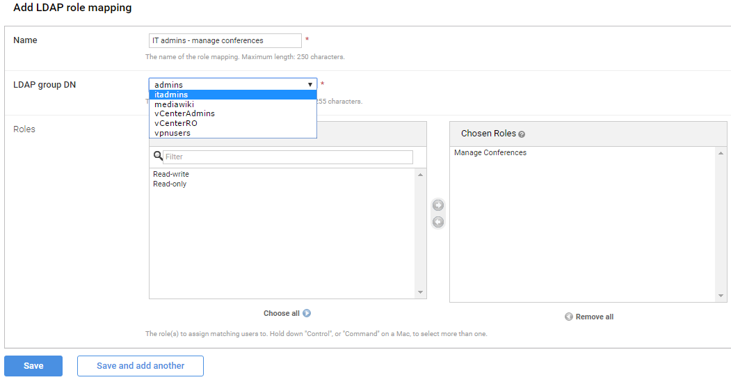 Here, we have configured an "IT admins - manage conferences" role with a Source of LDAP. The LDAP group DN drop-down presents a list of LDAP groups from AD. In our case this list is filtered to only show those groups in the ou=groups organizational unit (due to the LDAP group search DN configuration in step 2).