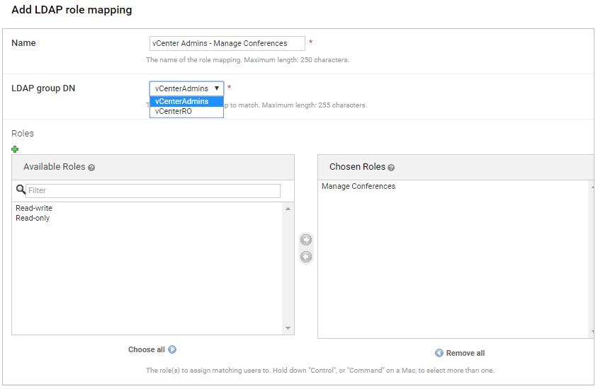 Here, we have configured a "vCenter Admins - Manage Conferences" role. The LDAP group DN drop-down presents a list of LDAP groups from AD. In our case this list is filtered to only show those groups whose name starts with "vc".