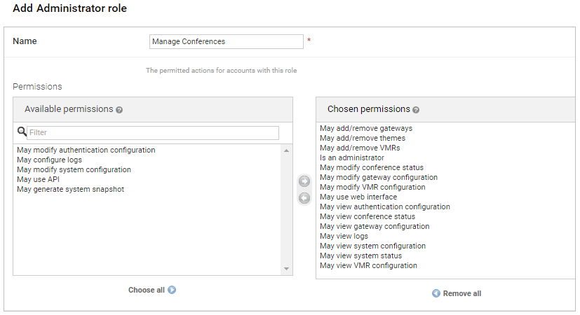Here, a "Manage Conferences" role has been created. The Chosen permissions allow an administrator to use the web interface to configure all service-related items such as VMRs, themes, gateway rules, but to only be able to view (and not modify) all other configuration.