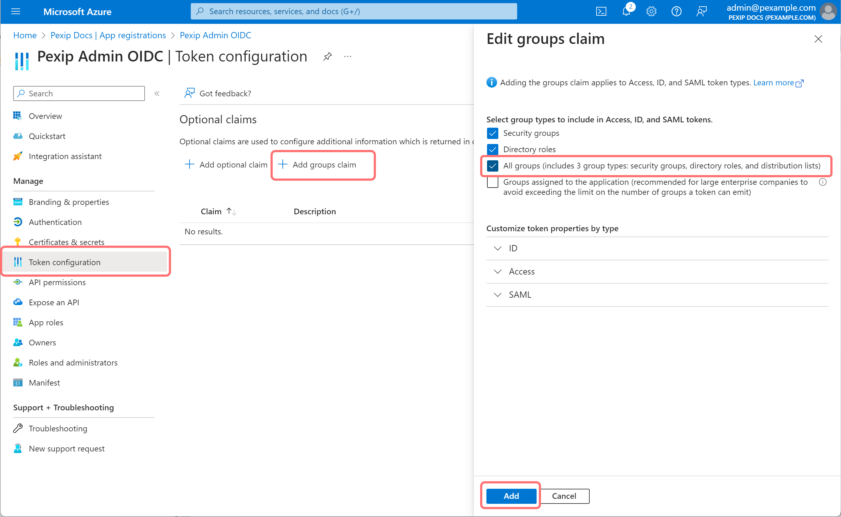 From the panel on the left, select Token configuration. Select , select All groups..., and then select :