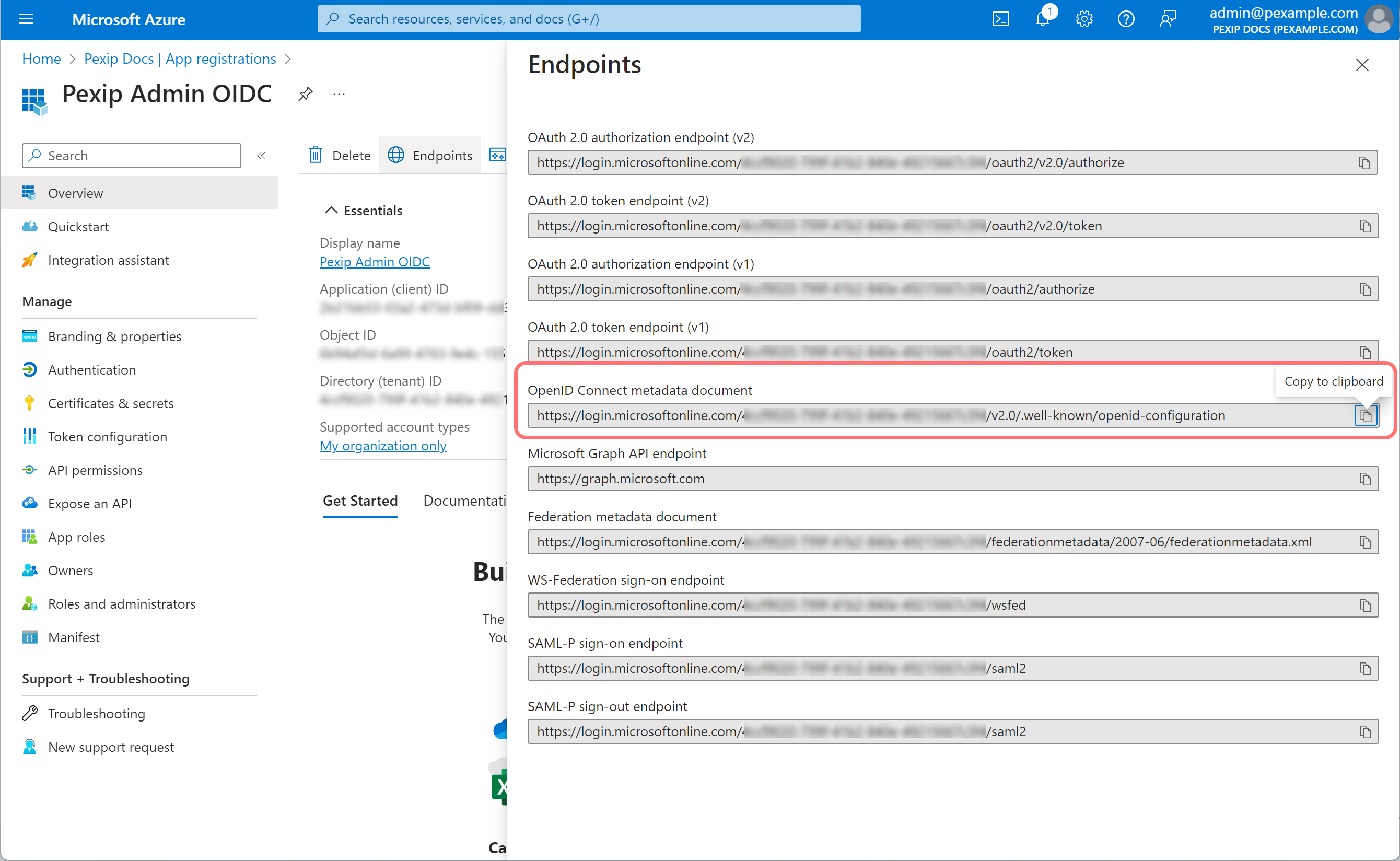 Select the Endpoints tab, and copy the OpenID Connect metadata document (this ends in openid-configuration). You must enter this as the Metadata URL when configuring Pexip Infinity: