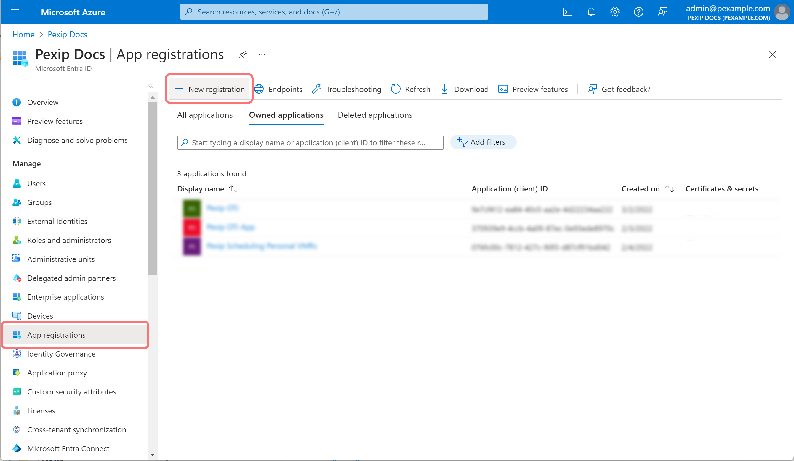 Log in to the Azure portal and select Microsoft Entra ID. From the panel on the left select App registrations and then select New registration: