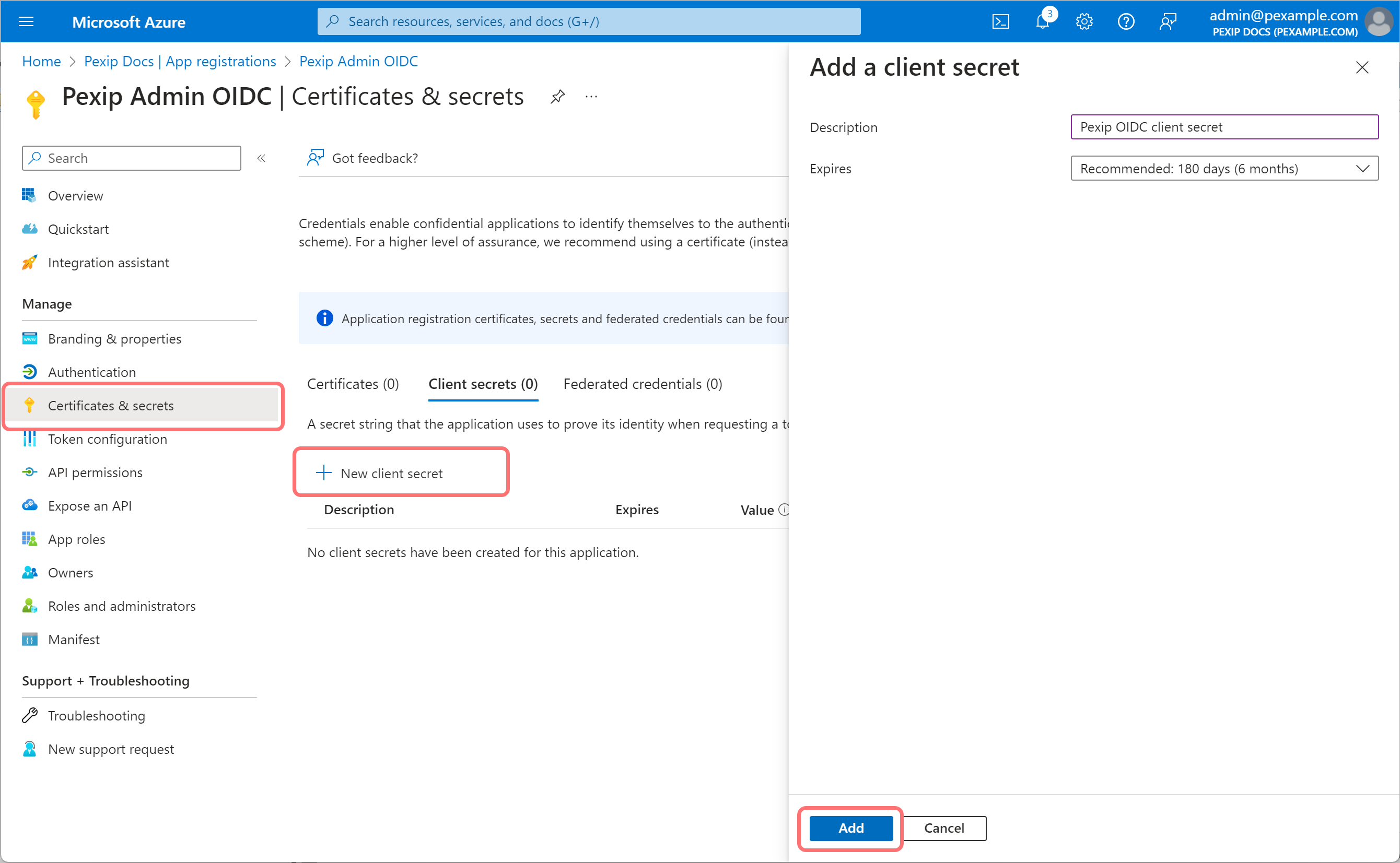 From the panel on the left, select Certificates & secrets. Select , complete the fields, and then select :