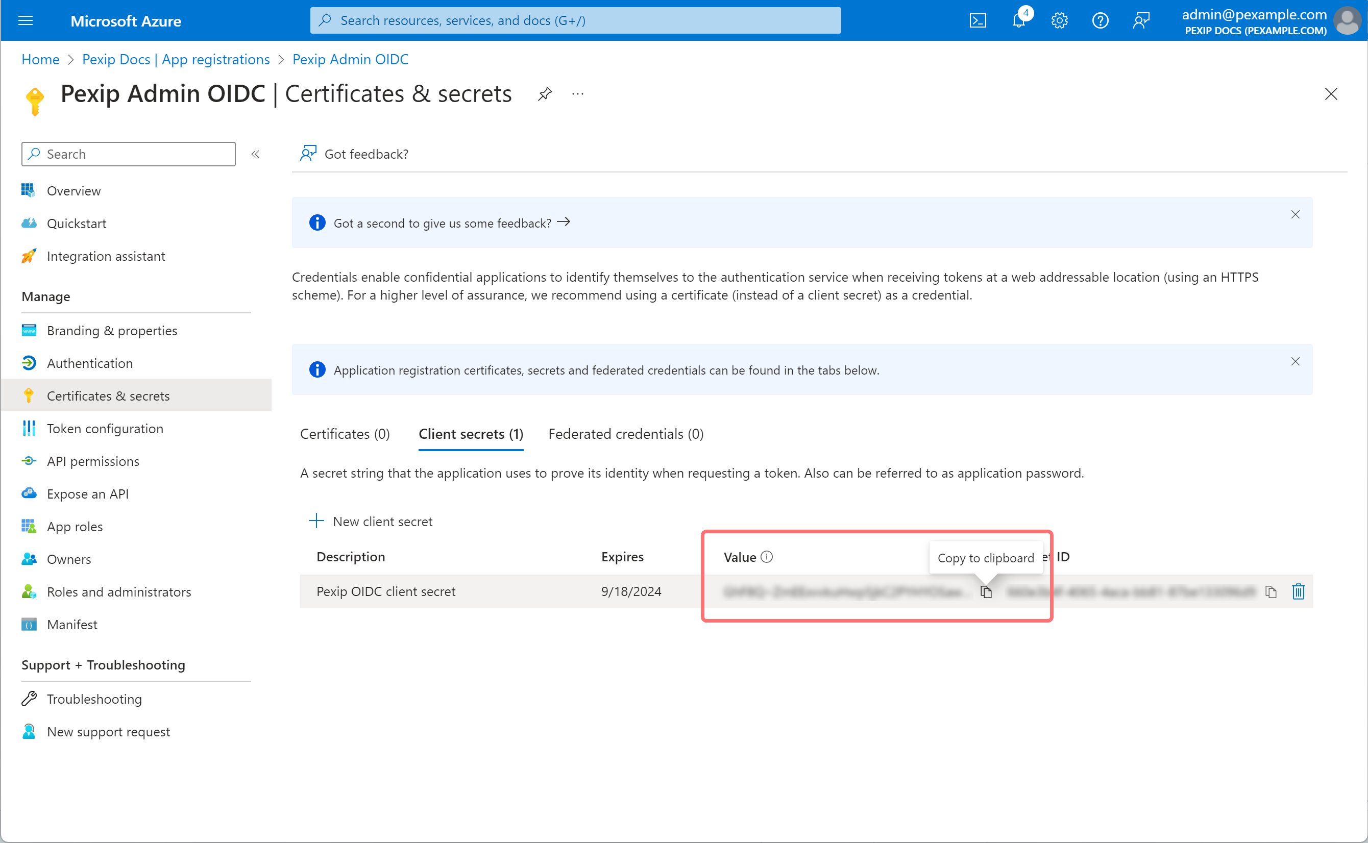 Before you navigate away from the page you must copy the string in the Value field (do not copy the string in the Secret ID field). You must enter this as the Client secret when configuring Pexip Infinity: