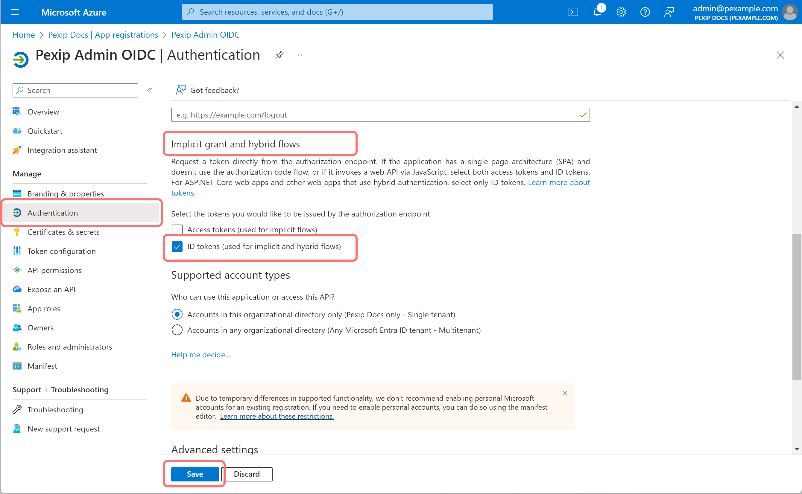From the panel on the left, select Authentication and scroll down to Implicit grant and hybrid flows. Select ID tokens and then select :