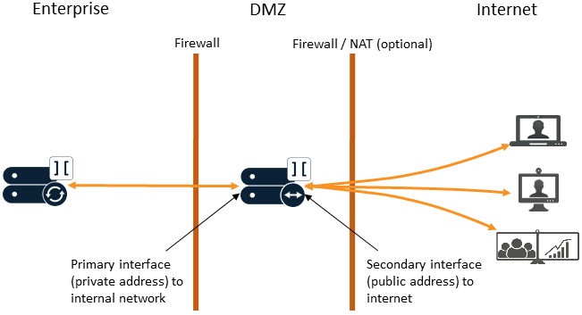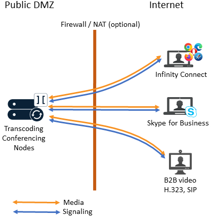 • One or more Transcoding Conferencing Nodes are deployed in a public DMZ. They have publicly-reachable IP addresses — either directly or via static NAT.