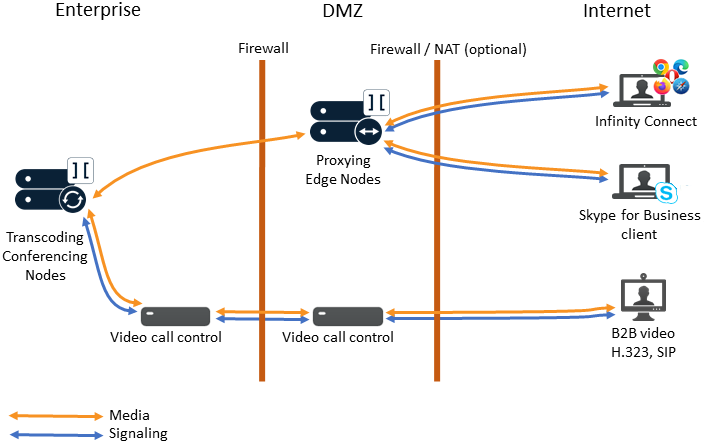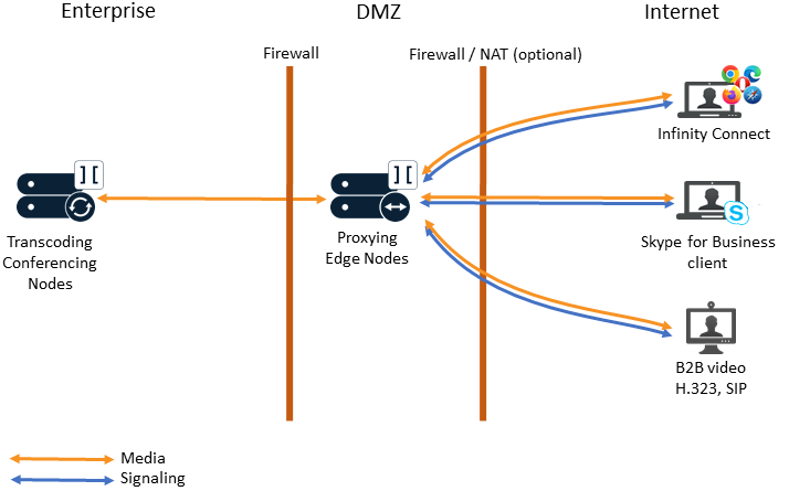 • In large deployments you may want to consider whether to deploy some dedicated Proxying Edge Nodes to manage the signaling and media connections between endpoints situated on the public internet and your Transcoding Conferencing Nodes.