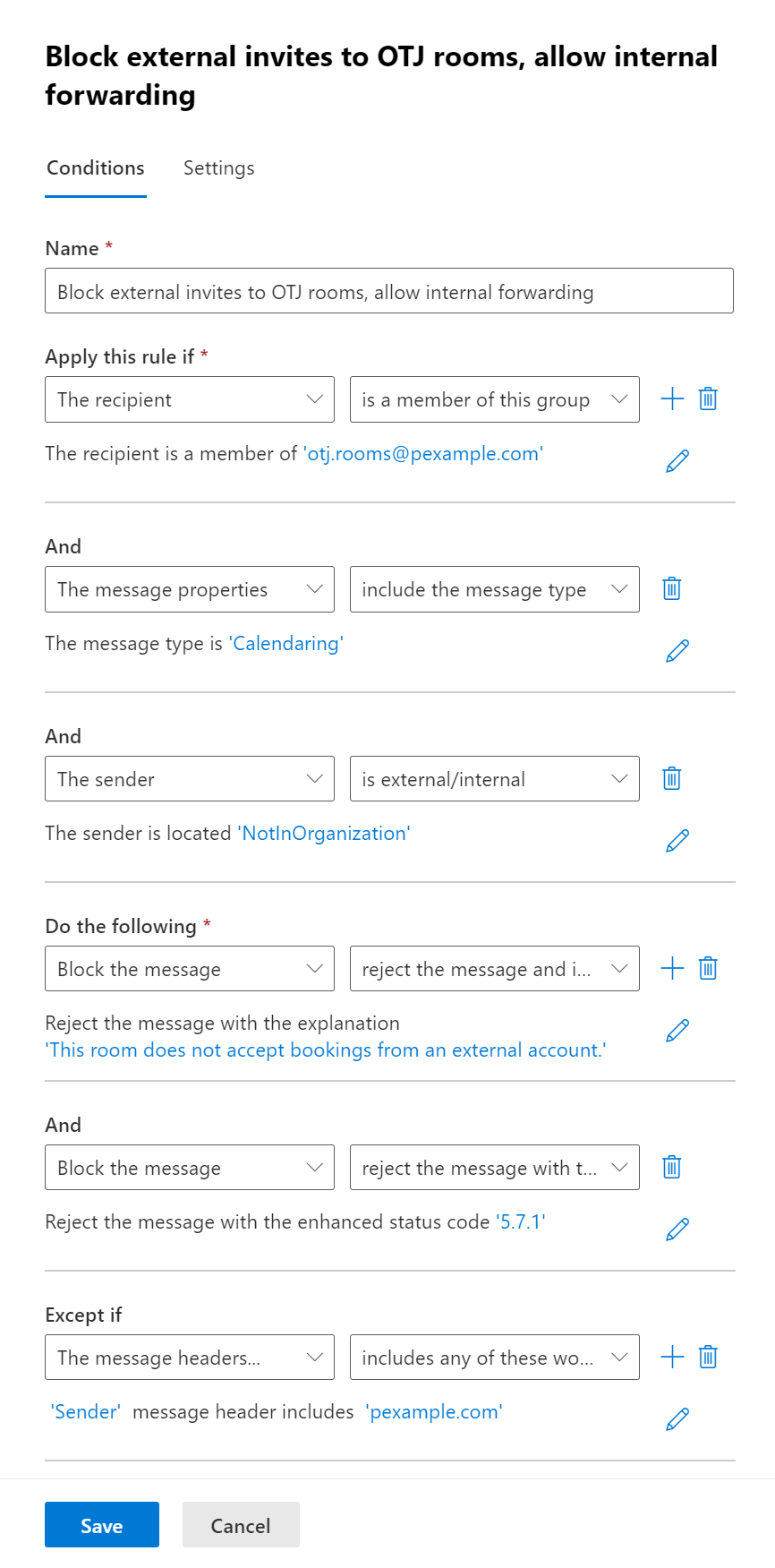 If you want to enable users to forward invitations from other organizations to your OTJ room resources, you must set the ProcessExternalMeetingMessages flag to True. Note that this allows any users external to your organization to invite the resource directly. To prevent this, you can use an Exchange transport rule similar to the example shown below so that only users internal to your organization can forward external invitations to OTJ meeting rooms.