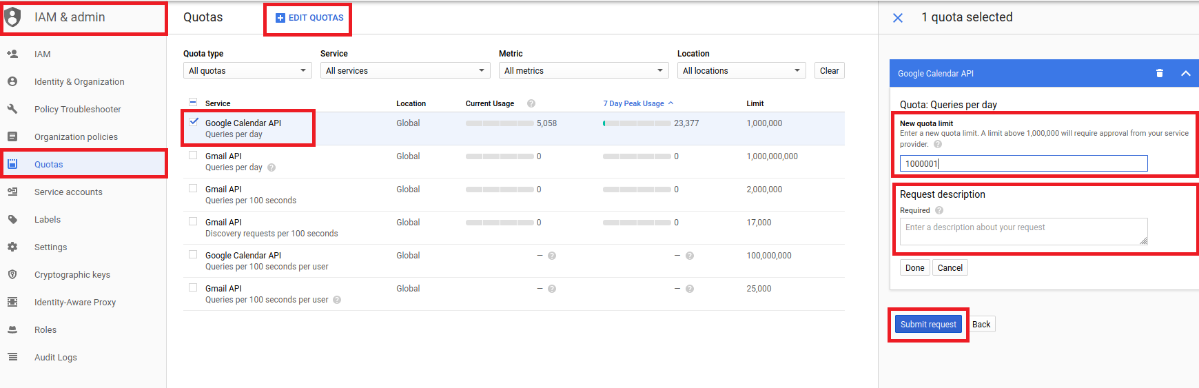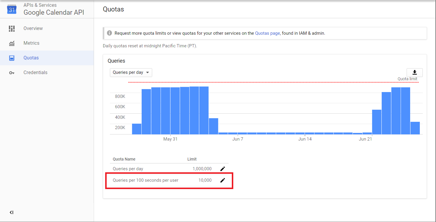 4. Updating the quota for the number of user requests per 100 seconds.