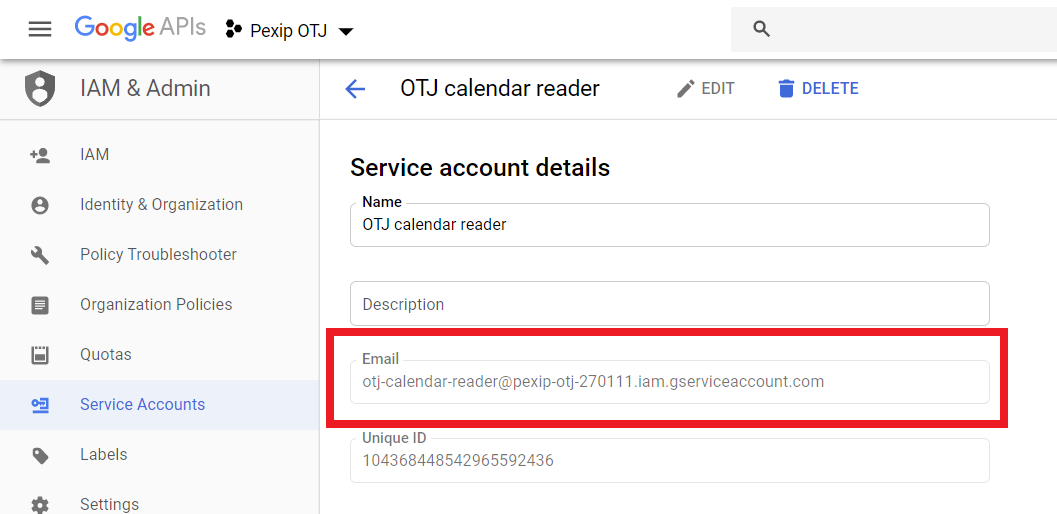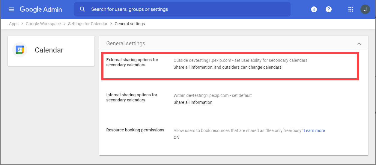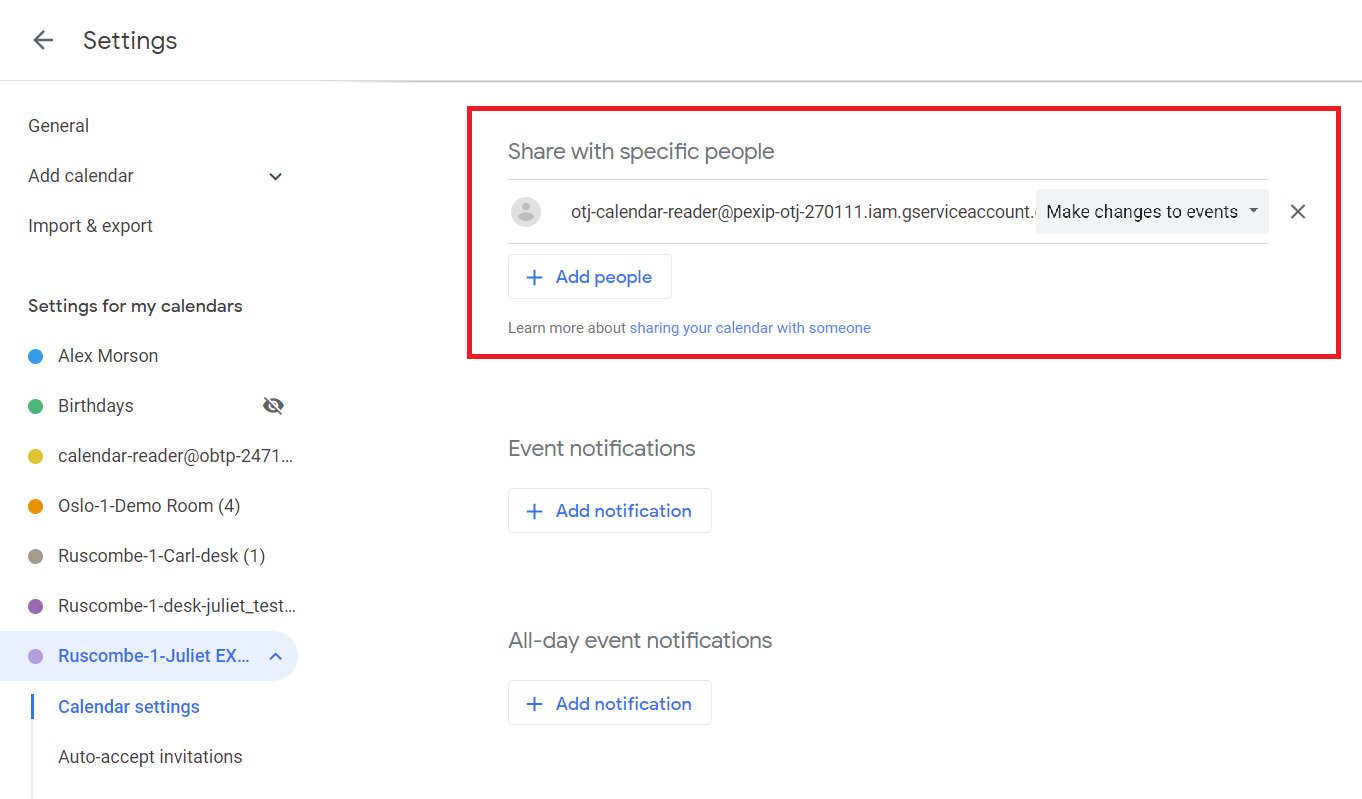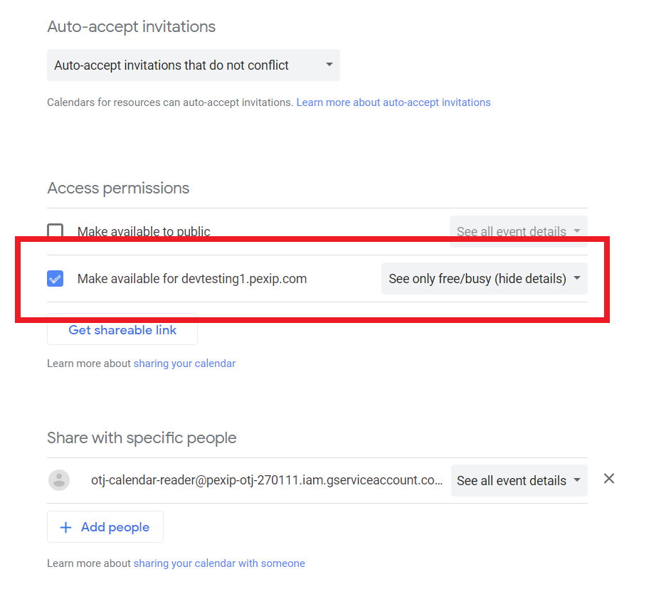 In the deployment model described below, the service account will require access to the endpoints' calendars. Google Workspace service accounts always use the iam.gserviceaccount.com domain rather than your own domain, so you will need to configure Google Workspace to allow endpoint calendars to be shared externally. This does not in itself allow any external accounts to access the calendars — each calendar must then also explicitly nominate the accounts with whom it is to be shared.