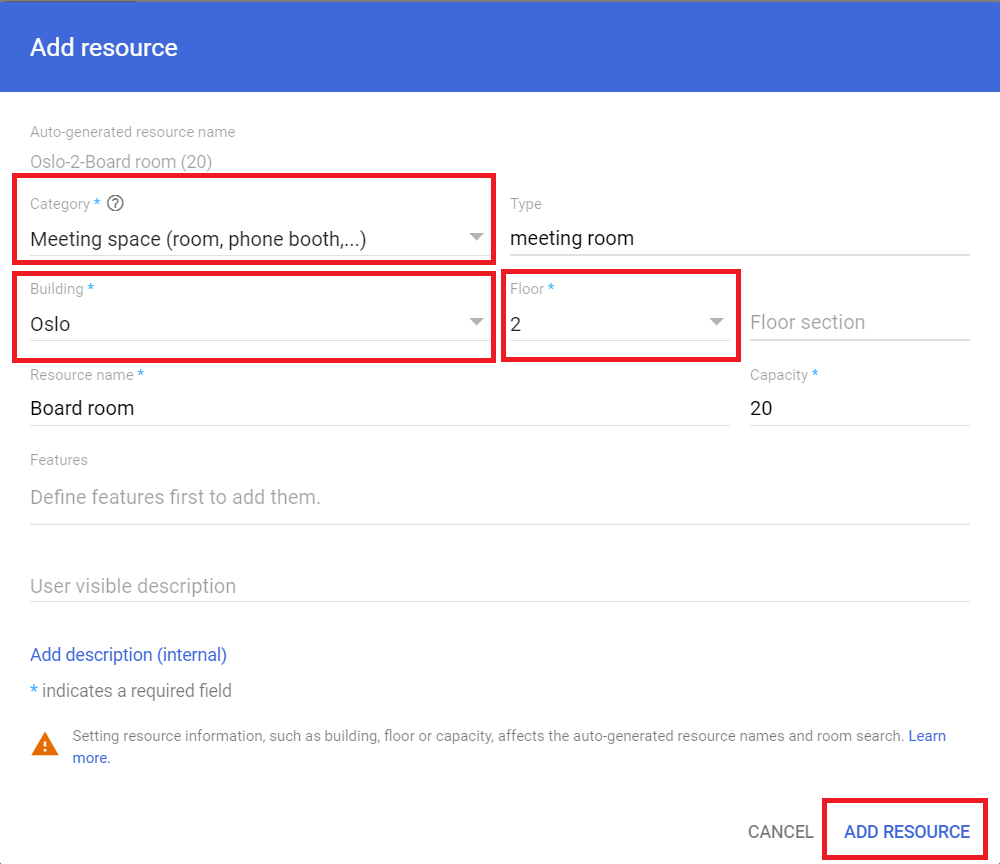 2. Creating a room resource for each physical room that will have a One-Touch Join endpoint in it.