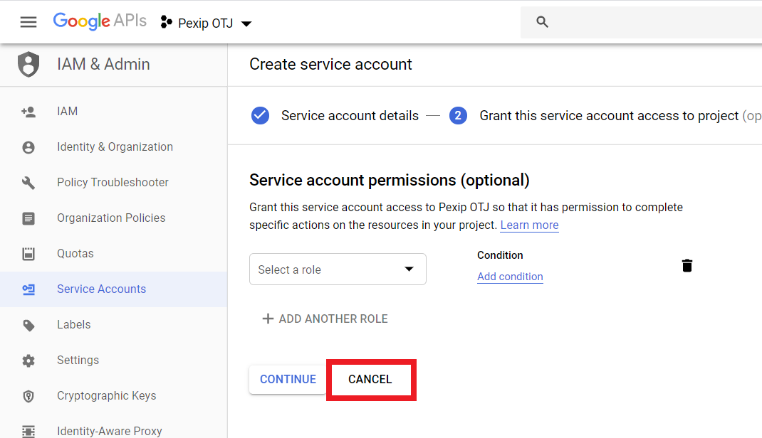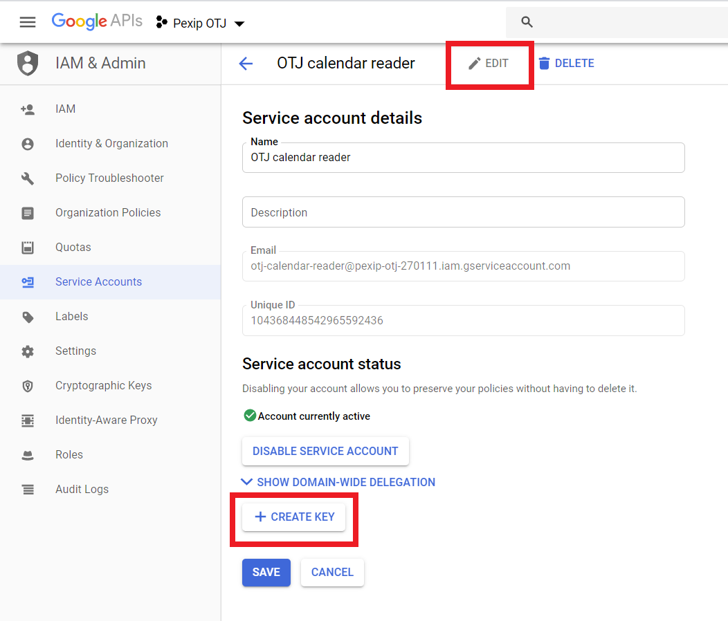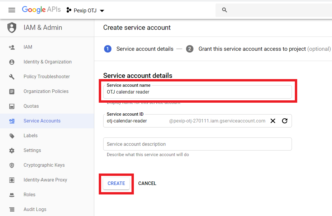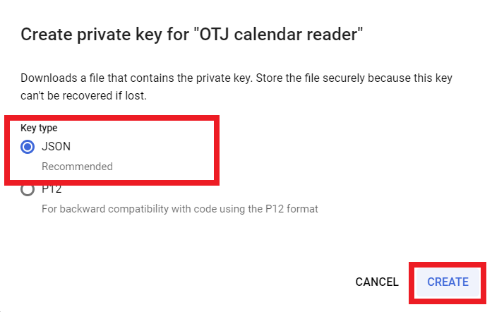 We recommend that you authorize One-Touch Join to access calendar information using a service account, as described in the following steps. This method (sometimes referred to as two-legged OAuth) offers the easiest setup for One-Touch Join, and is recommend by Google because it is designed for server-to-server applications (for more information, see https://developers.google.com/identity/protocols/oauth2/service-account). Alternatively, you may need to use a Google Workspace domain user for authorization (sometimes refered to as three-legged OAuth); for instructions on how to do this, see Configuring Google Workspace for domain user authorization.