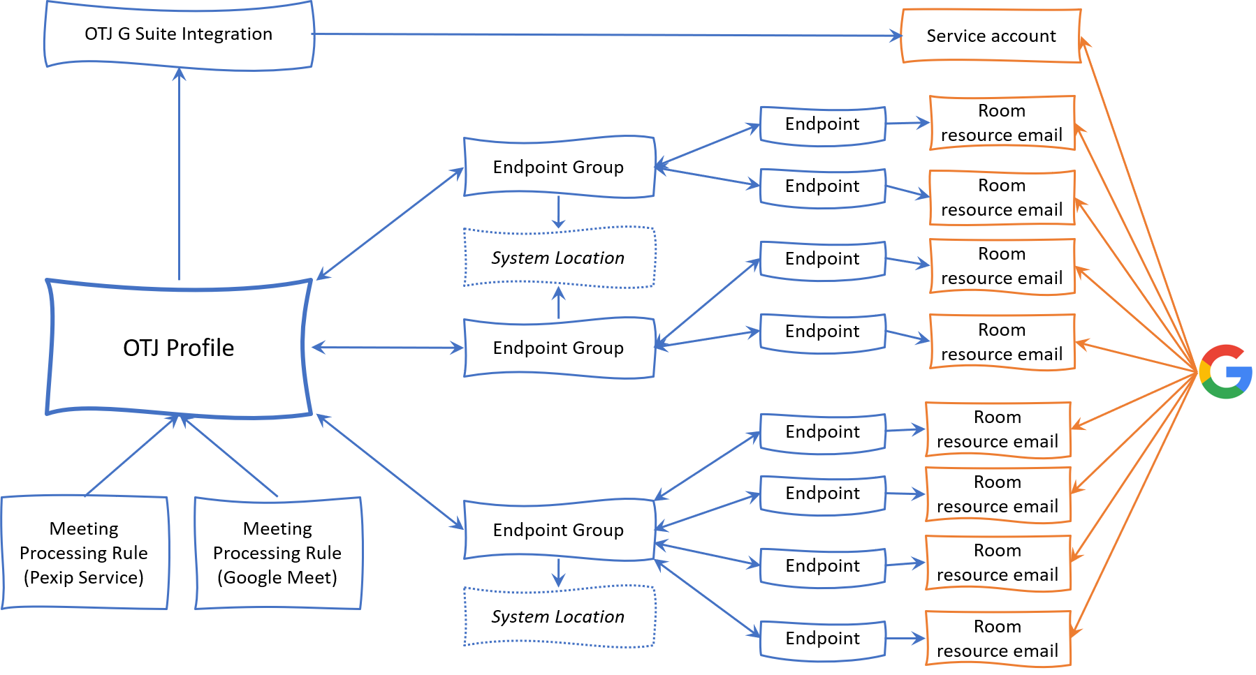 The diagram below shows (in blue) the components that are configured on Pexip Infinity and how they are related to each other. It also shows (in orange) how the Pexip Infinity components are associated with your calendar/email service — in this example we have used Google Workspace, with support for