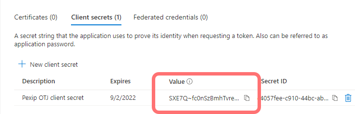 The string in the Value field of the client secret for this OTJ Graph API application. If you didn't copy this at the time the registration was created, you'll need to generate a new one. |