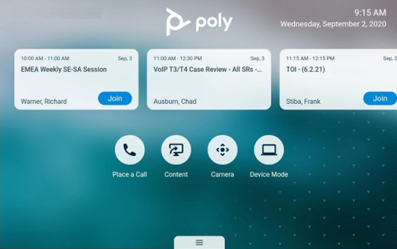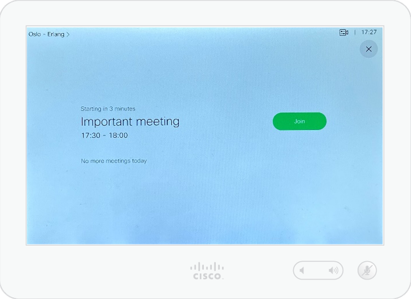 3. Each endpoint in each meeting room displays a list of scheduled meetings for that room. When a meeting is due to start, the endpoint in the room will show a Join or Join meeting button.