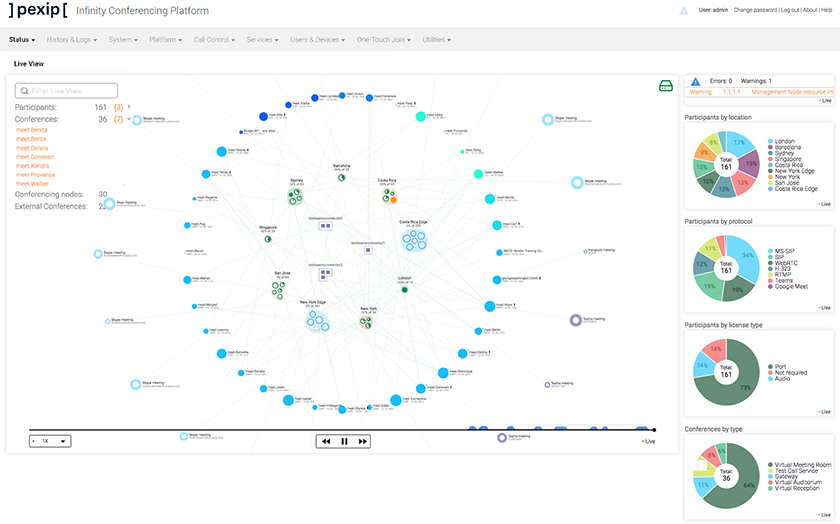 - pie charts showing a breakdown of participants by location, protocol, license type and the different conference types being hosted.